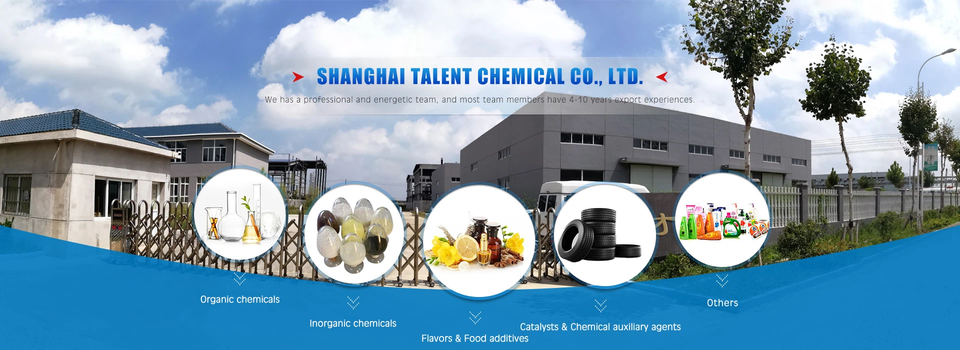 Shanghai Talent Chemical Co., Ltd. berlokasi di pusat ekonomi China---Shanghai, yang memiliki lebih dari 30 karyawan dan 450㎡ kantor sekarang.Kami berspesialisasi dalam menyediakan produk kimia yang melimpah untuk memenuhi permintaan pelanggan, dan juga dapat menyediakan layanan produk yang disesuaikan. Saat ini, kami terutama mengekspor bahan kimia organik, bahan kimia anorganik, perasa & aditif makanan, katalis & bahan pembantu kimia, dll.